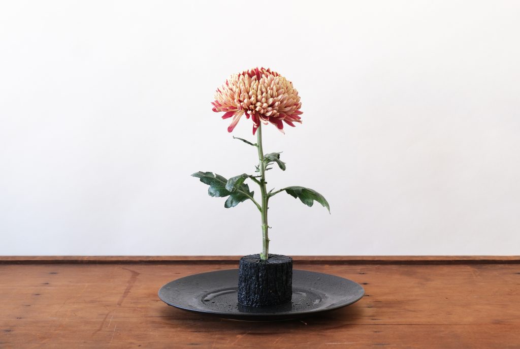 「クチュールブラッシュ」という、花弁の表がワインレッド、裏がベージュの大輪のマムを、菊炭(きくずみ)に挿しました(このようなモダンな花は「マム」と呼ばれることが多いタイプです)。