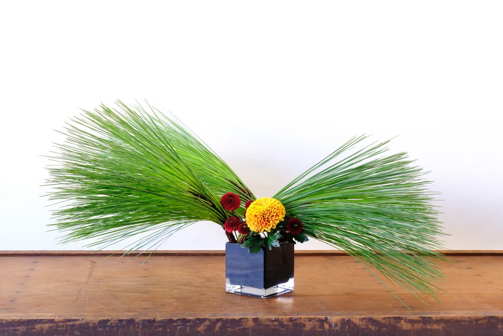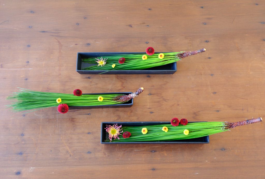 こちらは四角い皿に剣山を置き、「古都のしぐれ」「パーペッタレッド」、そして大王松を挿しました。