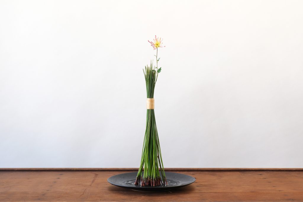 「大王松(だいおうしょう)」の長い葉を摘み取り束ね、一輪の菊を添えました。