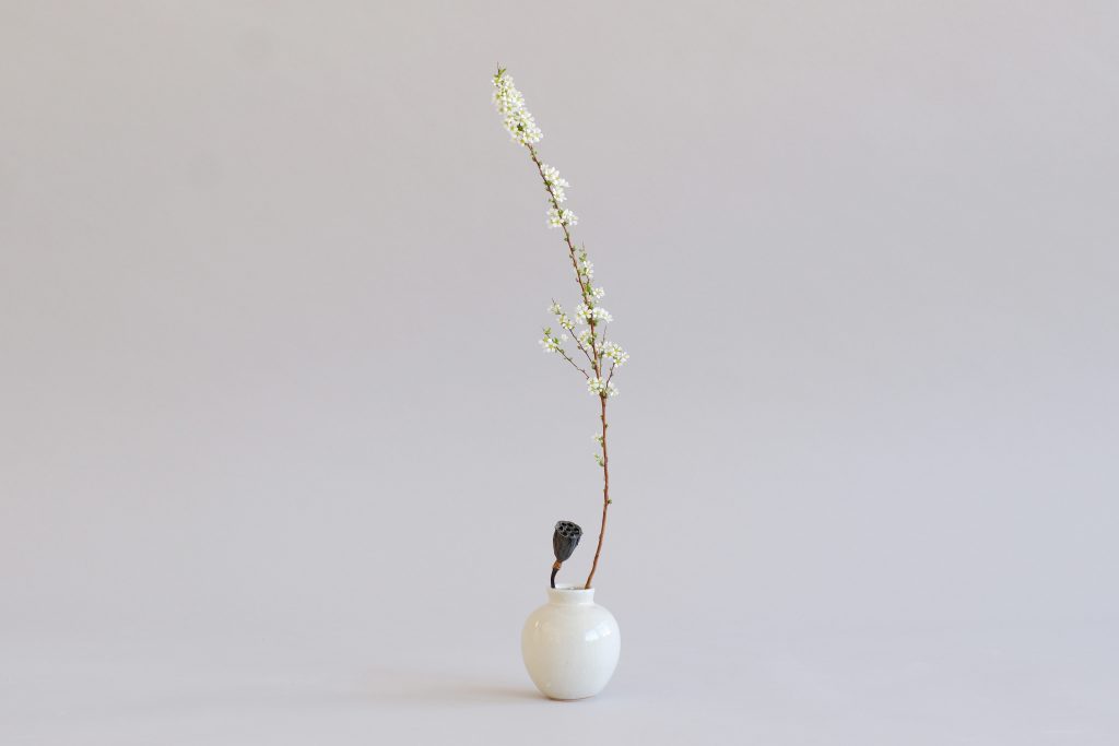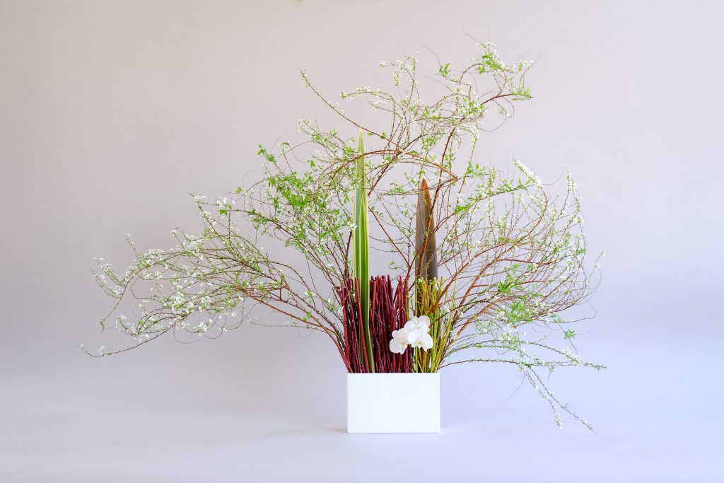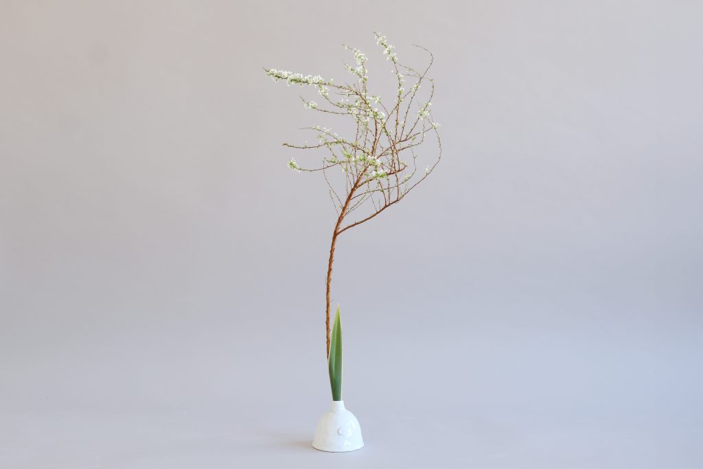 ミズキのまっすぐに伸びる直線と色のコントラストに、円弧を描く雪柳の動きが加わることで、シンプルながらも印象的な表情が生まれます。