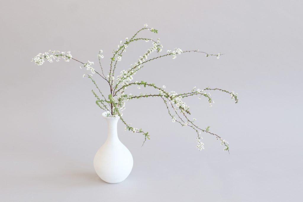 枝が自然に上向く位置を見つけたら、あえて枝を少し寝かせるようにして花器へ挿してみましょう。ゆるやかな弧がうまれ、雪柳の軽やかさがいっそう引き立ちます。