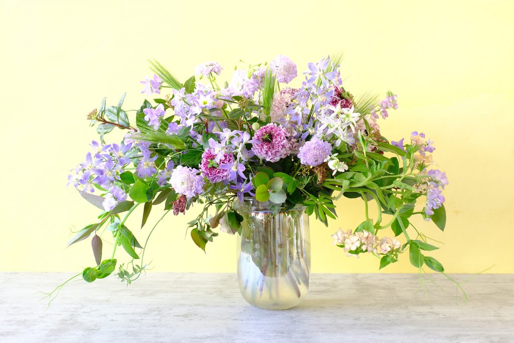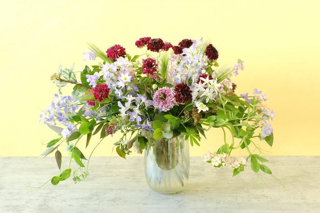 紫の濃淡のスカビオサを引き立てるのは、同系色の「デルフィニウム」「リューココリーネ」「フロックス」などの花々や、麦、ユーカリ、エンドウ豆の蔓といった草もの。