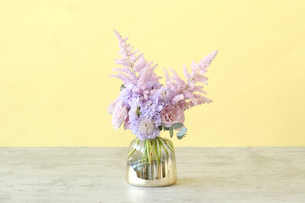 こちらは、淡い紫のスカビオサに、ニュアンスカラーの「バラ」や「アスチルベ」を合わせ、砂糖菓子のような雰囲気に仕上げています。