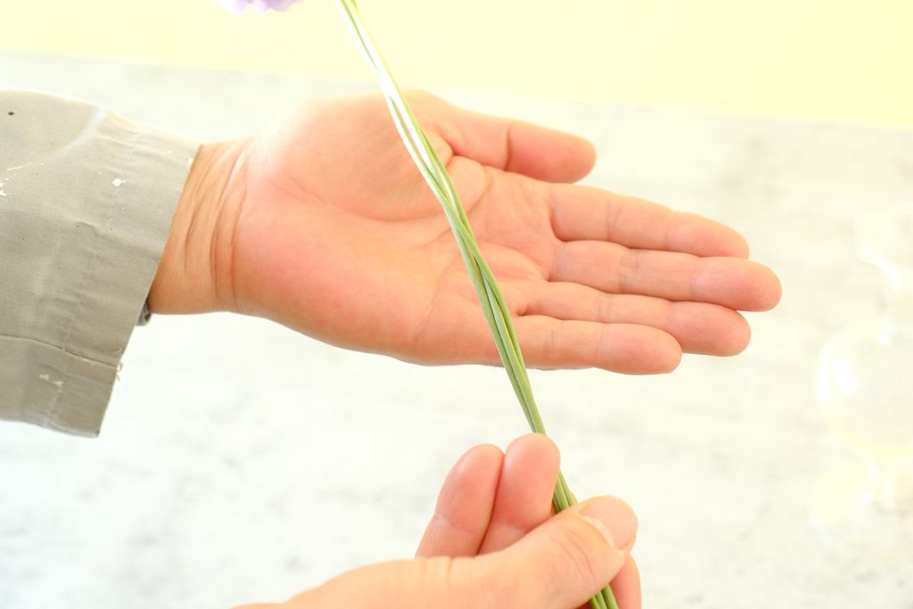 そのようなときには、写真のように茎を編むようにまとめてから生けると、狙った位置に生けやすくなります。