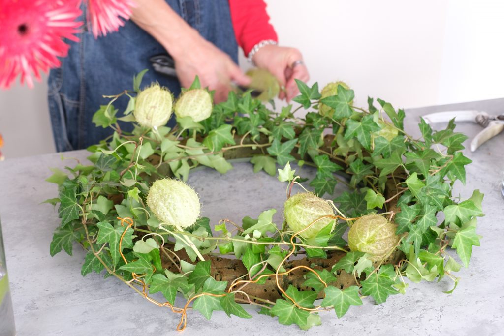 今回のテーマを象徴するような「カーネーション・ユカリグリーン」が入り、完成はもう間近です。