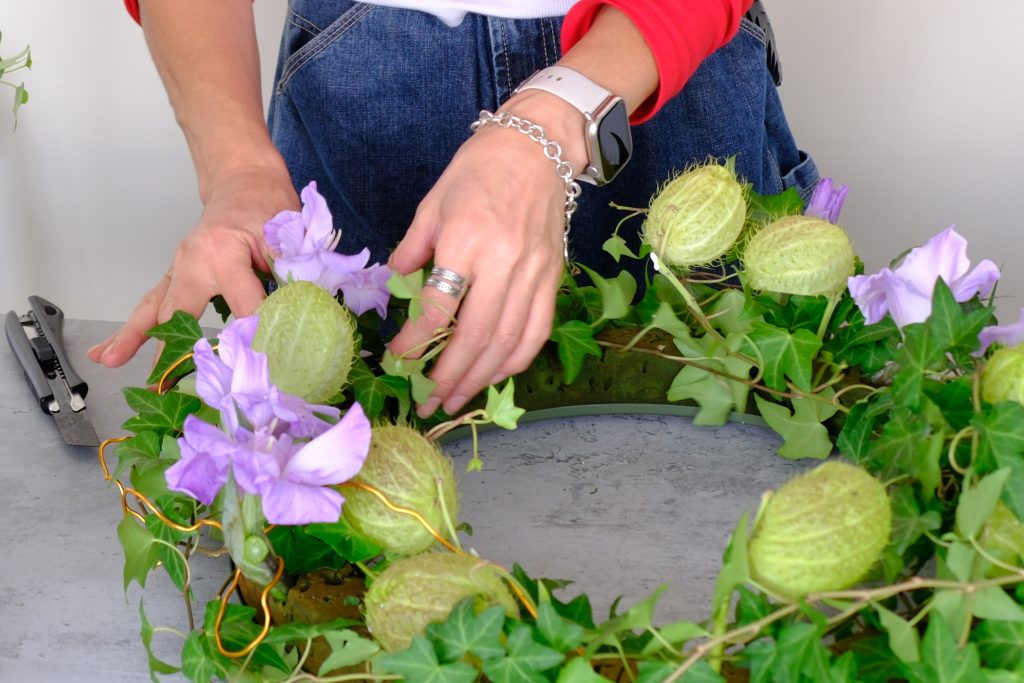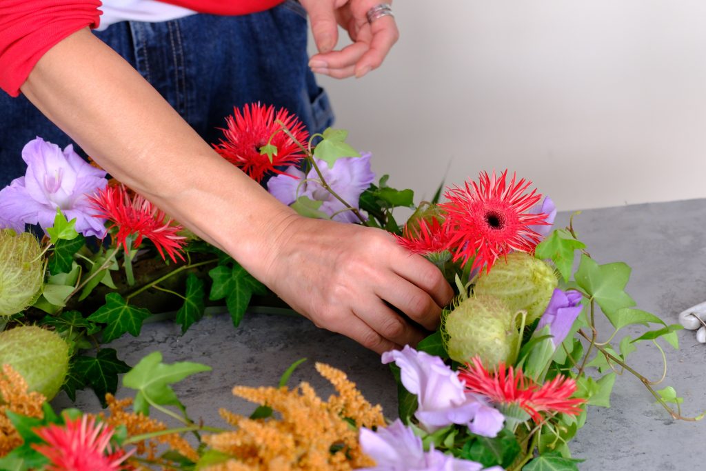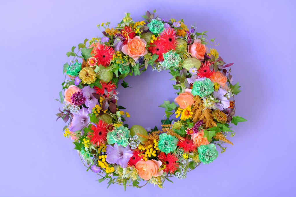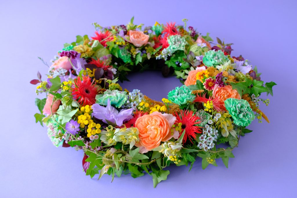 「トルコの連続する模様や、独特の色彩を花で表現しました。でも、モザイクタイルのようにきっちりした形は私らしくないと思ったので、そこは緩やかに捉えて、連続を意味するリースの形にしています」