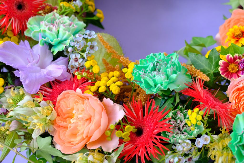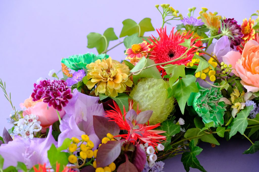 特に今回は、「スターチス」「アスター・ステラトップブルー」「グラジオラス・ミルカ」など、淡い紫の花が多く用意されました。