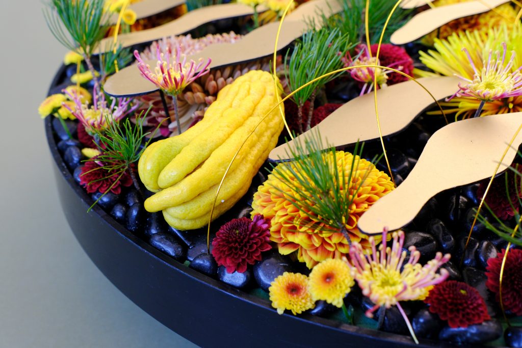 「花材は新春らしく、〈松〉と〈マム(菊)〉、そして〈仏手柑(ぶっしゅかん)〉を使っています。金の雲はひとつひとつ、雲型に切った台座に金色の紙を貼って作っています」