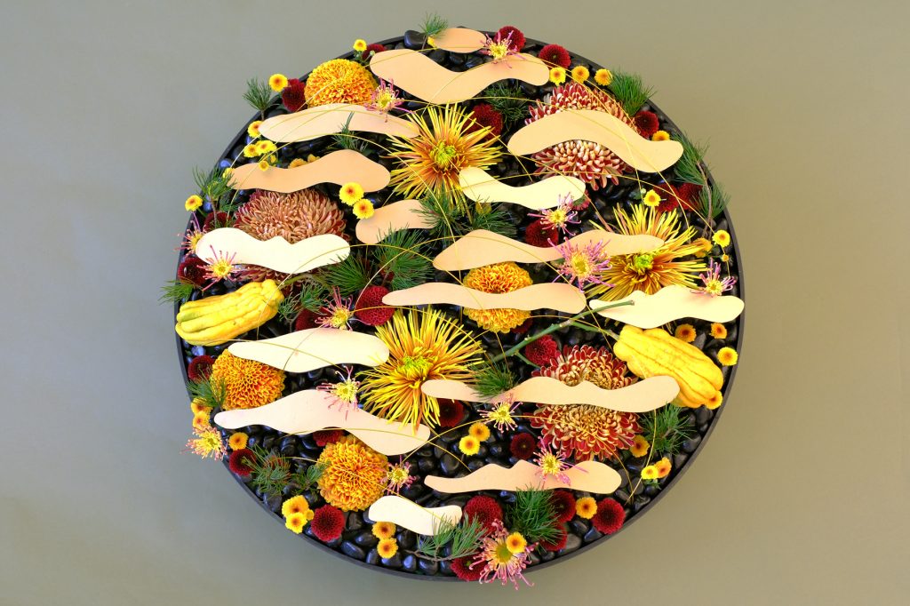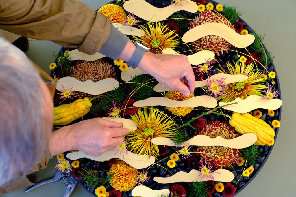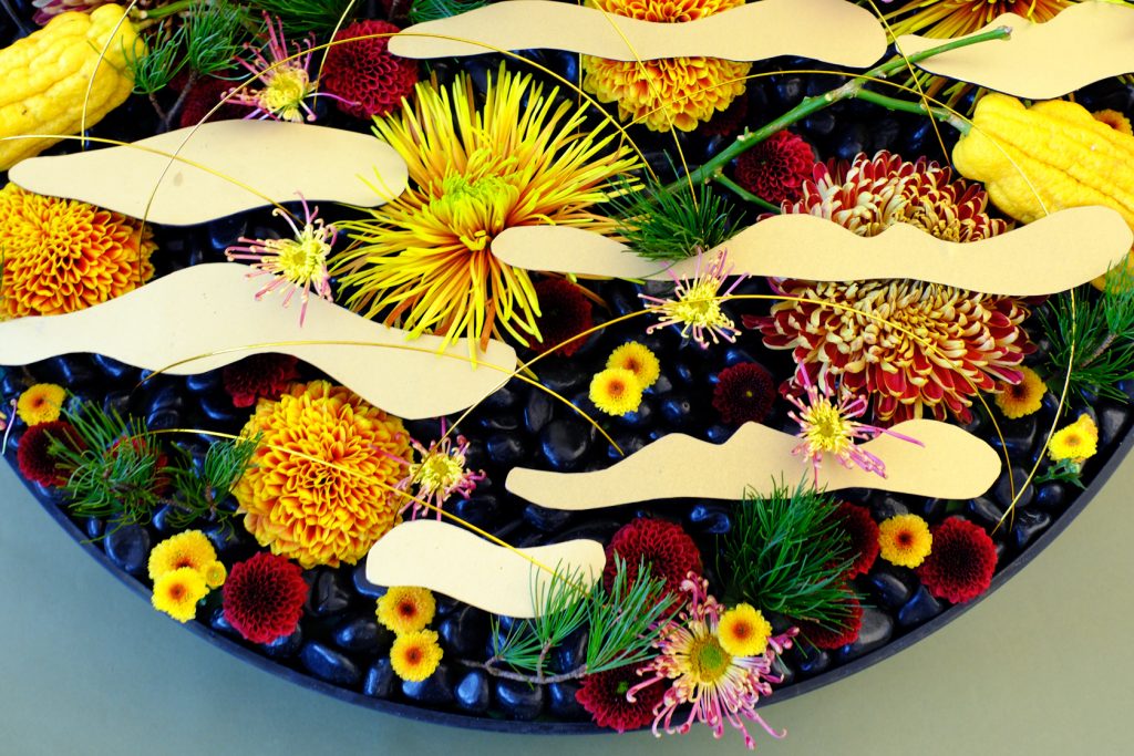 「今回はさまざまな種類のマムで、雲の間から見える町の人々を表現しています。マムはお正月の花材としてもよく使われる縁起のよい花ということもあり、最初からマムを使おうと決めていました。色や形の種類も豊富なので、洛中洛外図に描かれている建物や人をうまく表せたのではないかと思っています」