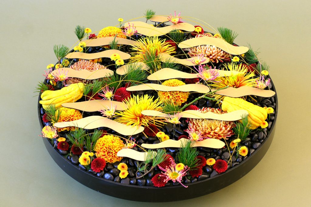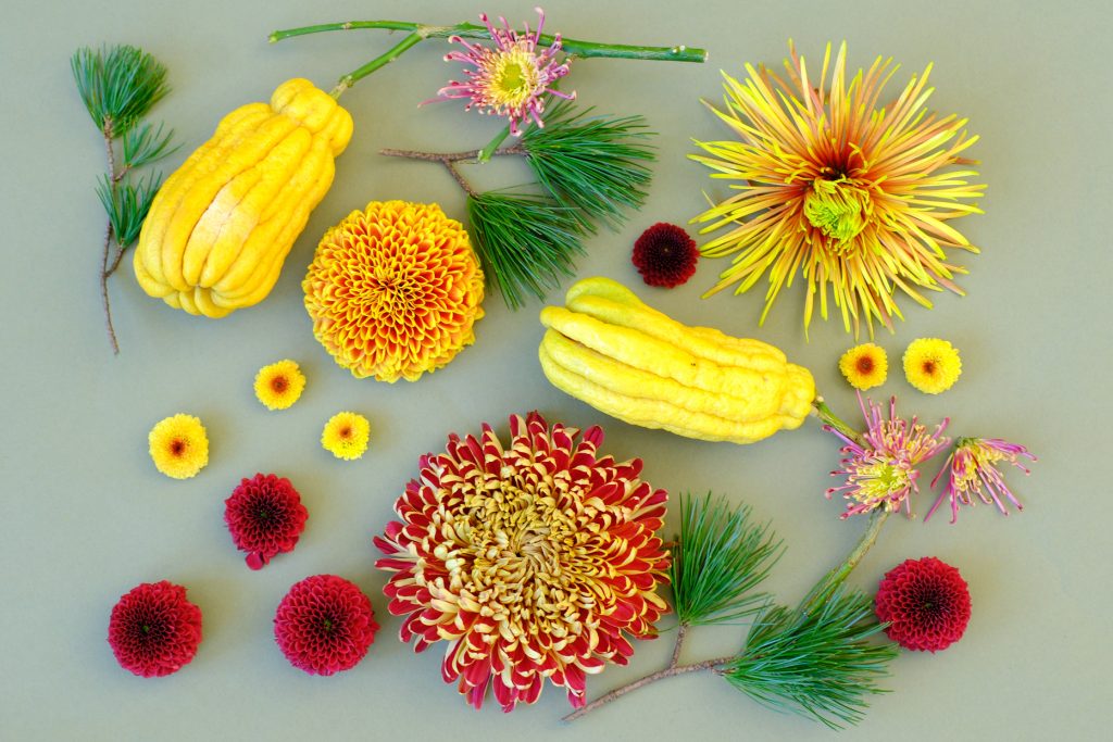今回の花材:松、仏手柑、マム(トロピカーナ、クチュールブラッシュ、チスパ)、スプレーマム(パーペッタレッド、カリメロシャイニー、古都のしぐれ)