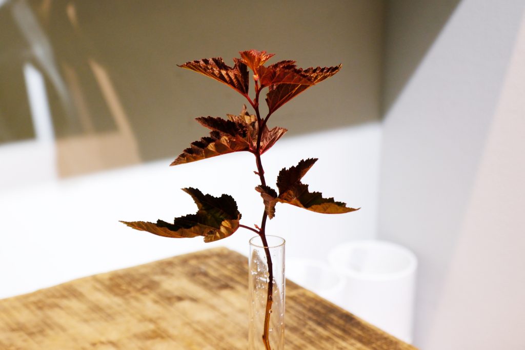 最初にテマリシモツケの葉を指します。長い枝は写真のように、2つのパーツに分けて使用することもできますので、花器の高さを考慮してカットしましょう。