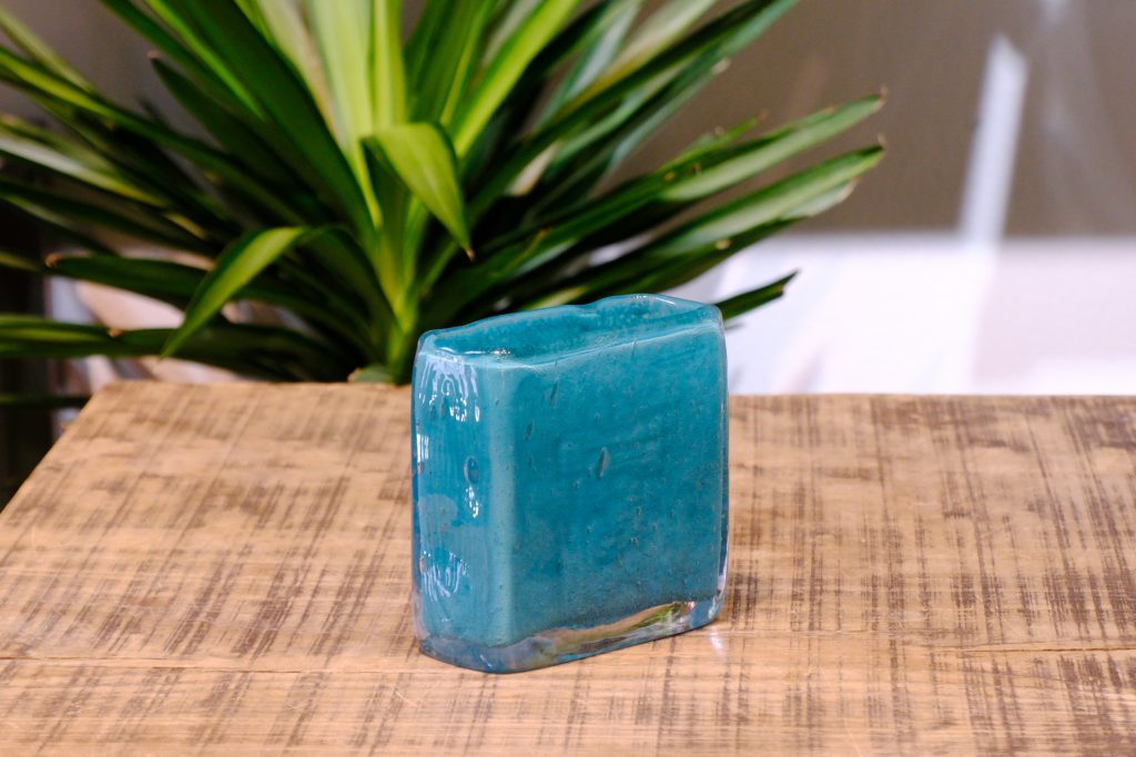 ここでは、ターコイズブルーが印象的な手吹きガラスの花器を使用しました。