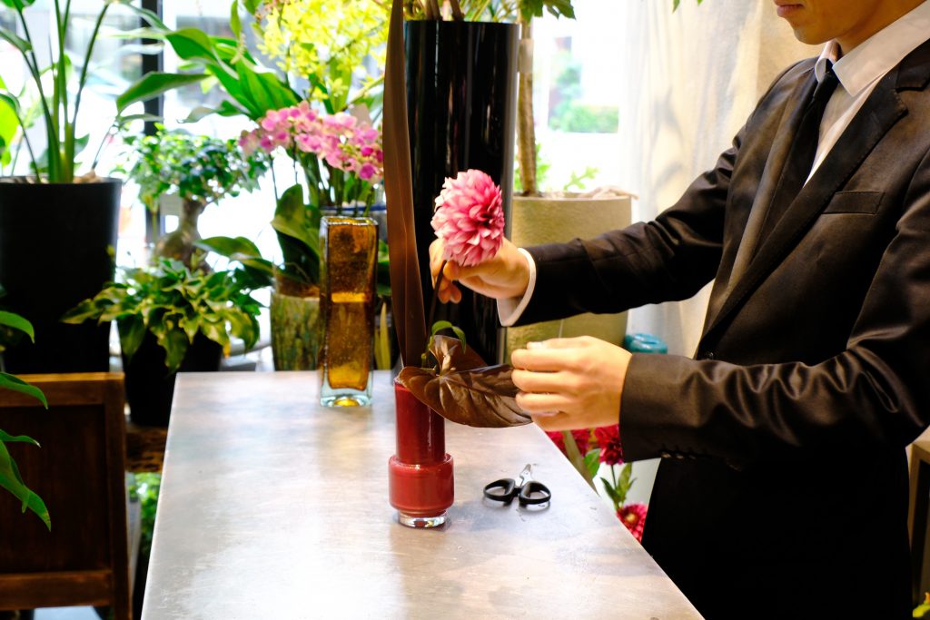 続いて、茎が見えない程度に短く切ったアンスリウムの葉を加え、最後に、ニューサイランの半分ほどの長さに切ったダリアを挿します。