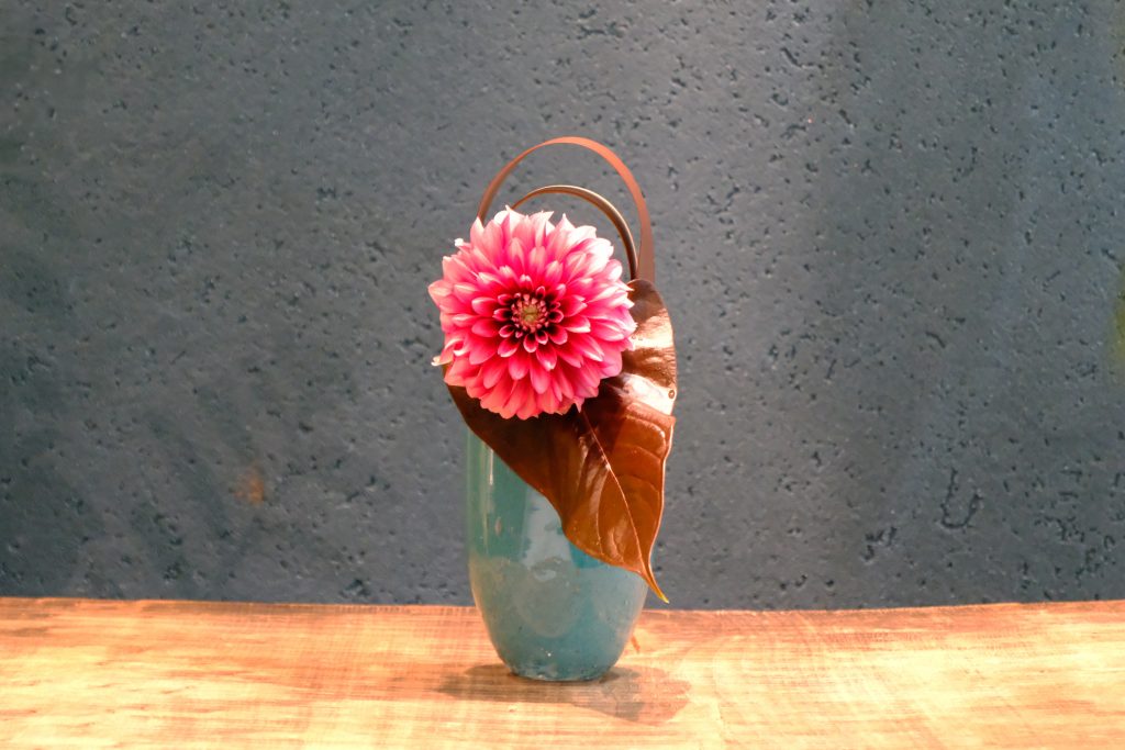細くした葉を花器の縁に沿わせるようにかけ、その空間にアンスリウムの葉と短くカットしたダリアを挿せば完成です。