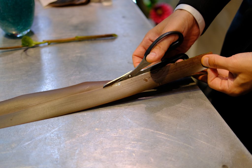まずはニューサイランを、花器の高さの約3倍の長さにカット。