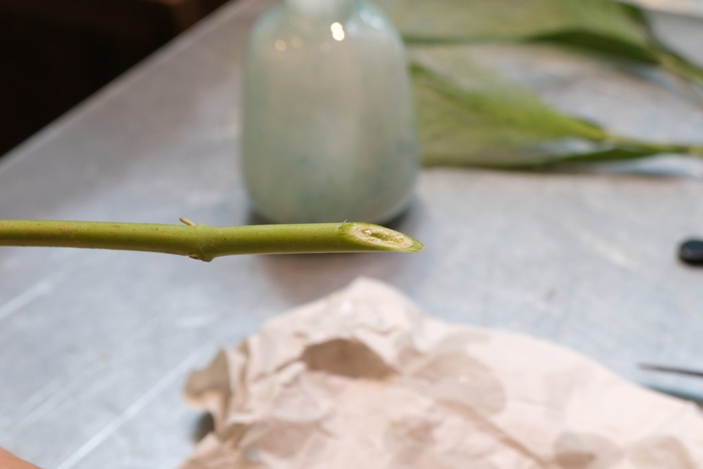 フウセントウワタは切り口から白い樹液が出るため、紙などで軽く拭き取ってから生けると水の濁りを防げます。