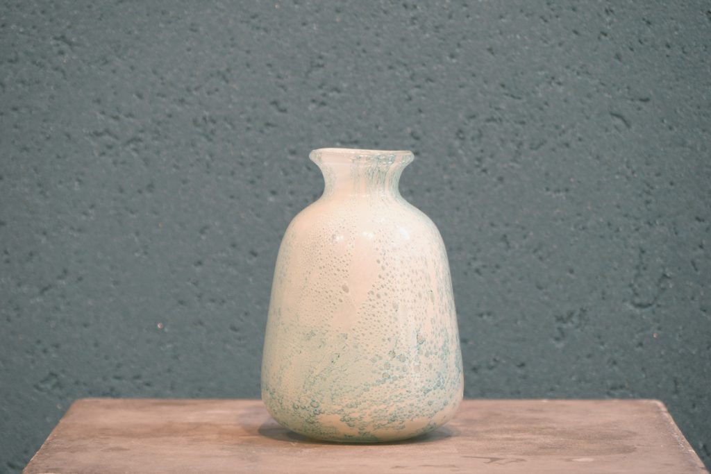 ぽってりとした白いガラスに、水色のマーブル模様が入った花器を使用しました。