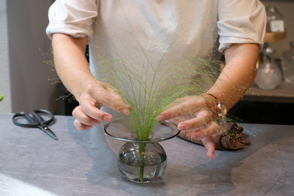 スモークグラスは葉をすべて落とし、花器の高さの約2〜2.5倍にカット。