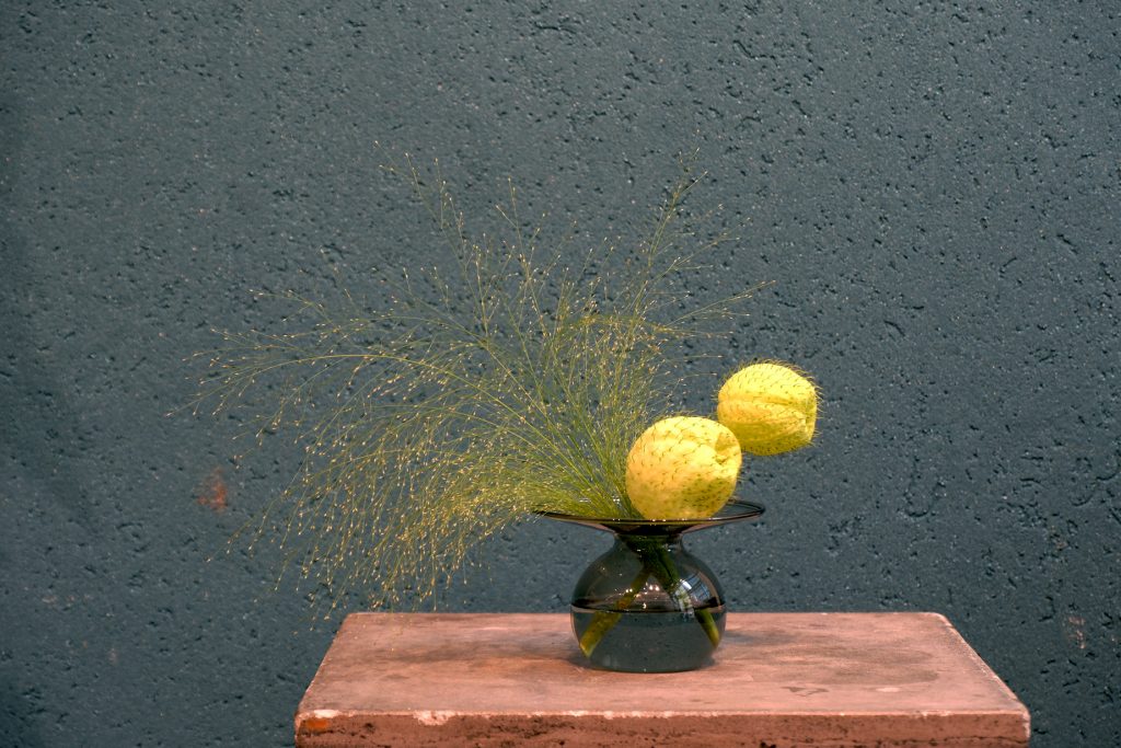 花器の高さの約3〜3.5倍の長さにカットしたフウセントウワタを挿し、雲のあいだから満月がのぞくようなイメージで、実のまわりをスモークグラスの穂がふんわりと包むように生けてみましょう。