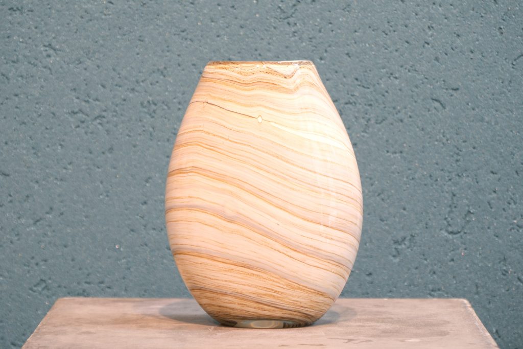 大理石のようなマーブル模様が入った、ゆったりとしたガラスの花器を使用しました。