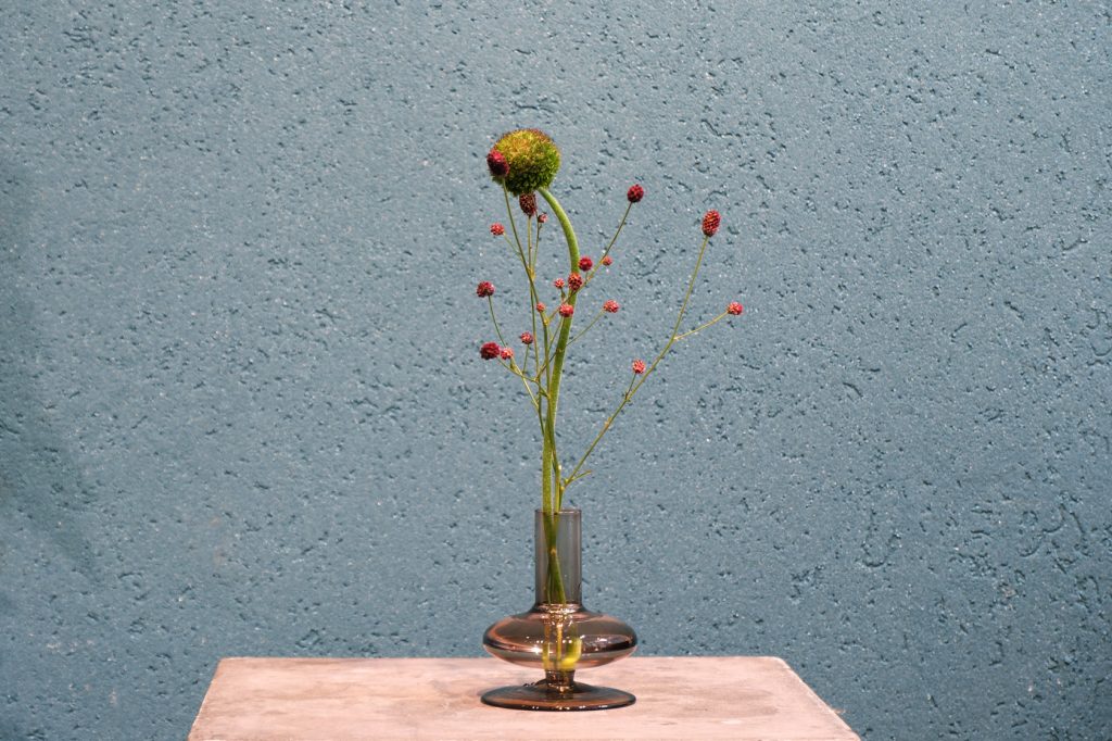 「今回は、ユニークな形のガーベラと、秋らしい質感のワレモコウを組み合わせて、個性と季節感のバランスを楽しんでみました。