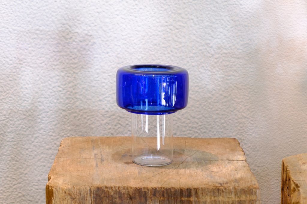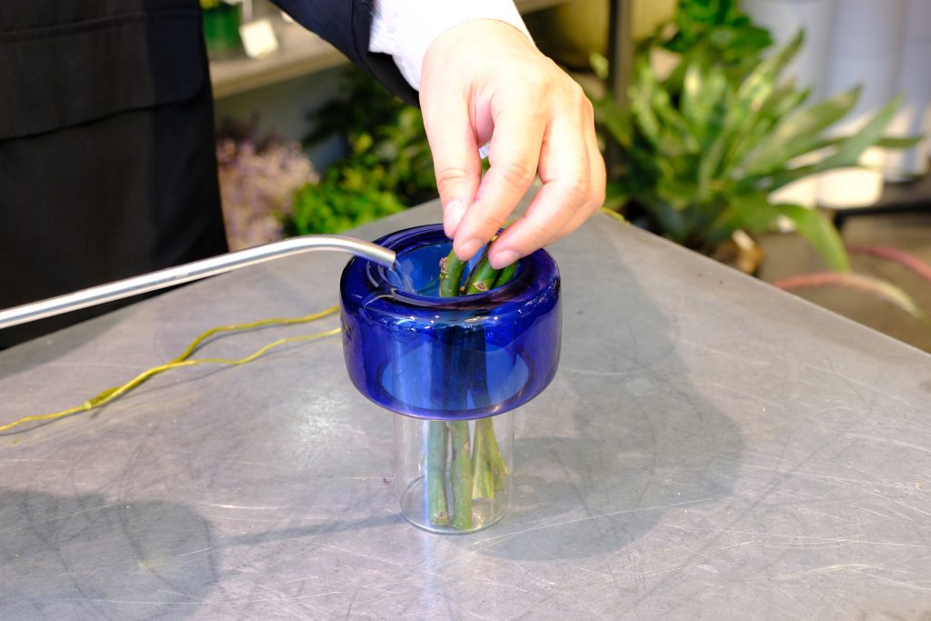 後半は、コバルトブルーと透明なガラスを組み合わせたユニークな花器を選びました。