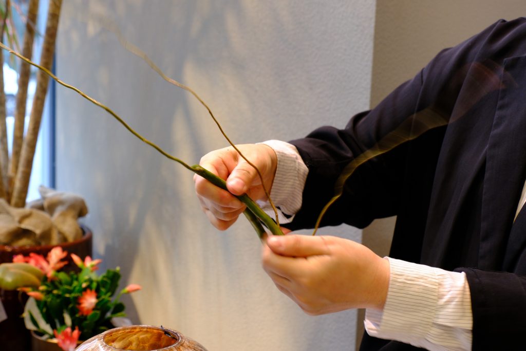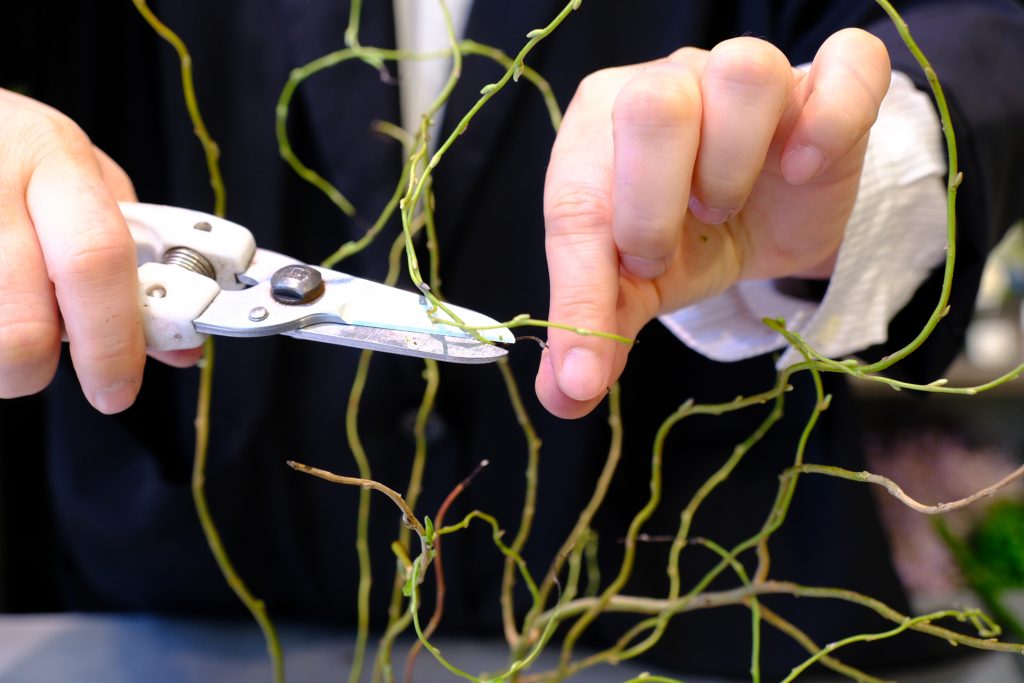・花器の中で花が動いてしまう場合は、余った枝を同じ長さに切りそろえたものを花器に入れると花留めになります。