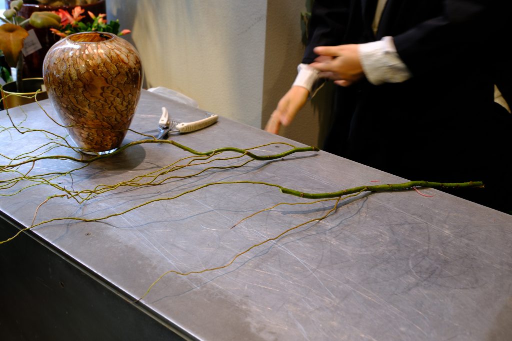 ・ドラゴン柳は花器の高さの約3倍にカットし、枝の流れを活かすように斜めに挿します。