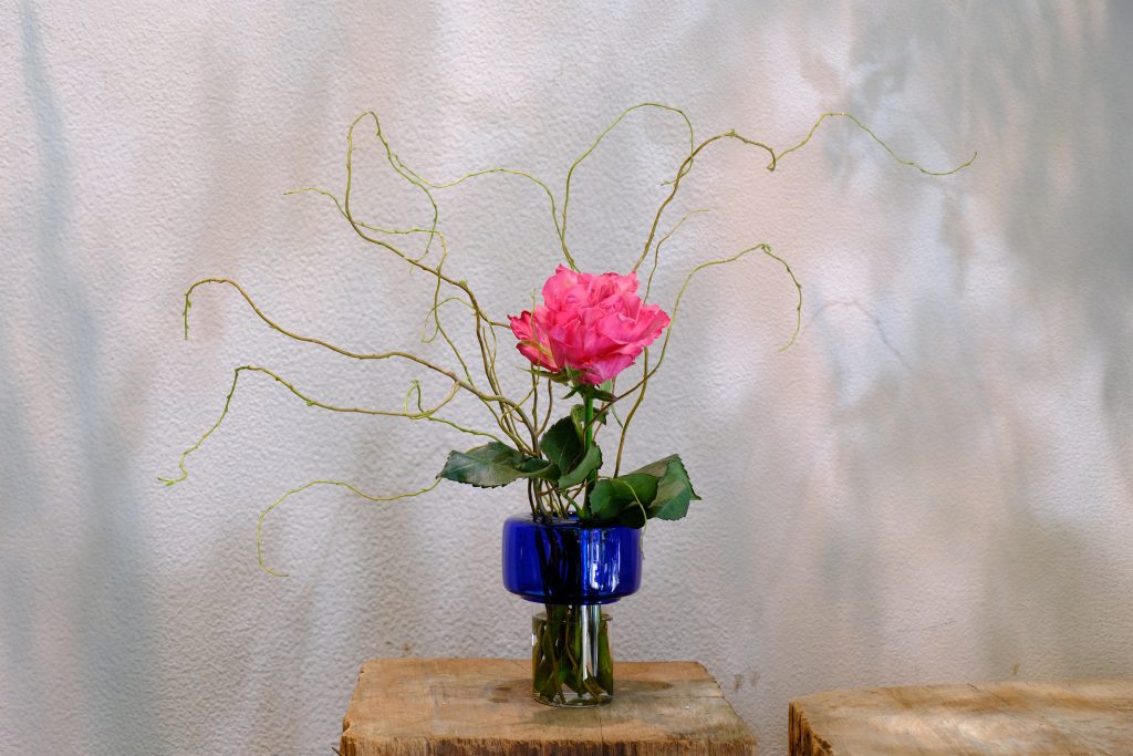 ドラゴン柳の曲線が生み出す立体感と、深みのある花色が響き合い、季節の変化を感じさせてくれます。