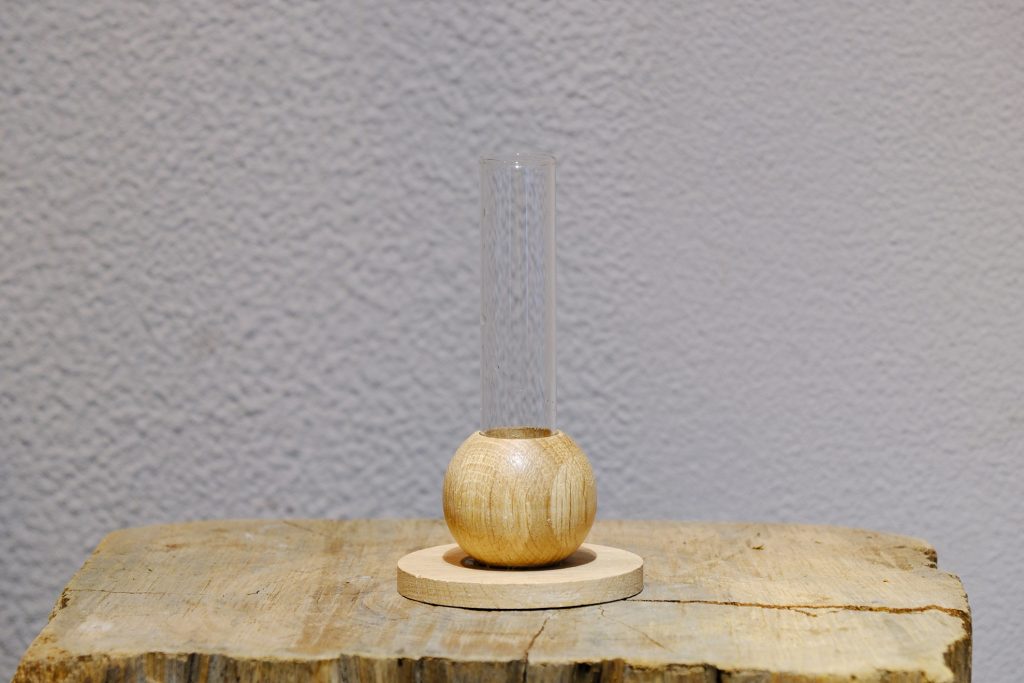 高さ約14cmの一輪挿しを使用しました。ガラスと木の組み合わせが、素朴なチューリップの美しさを引き立てます。