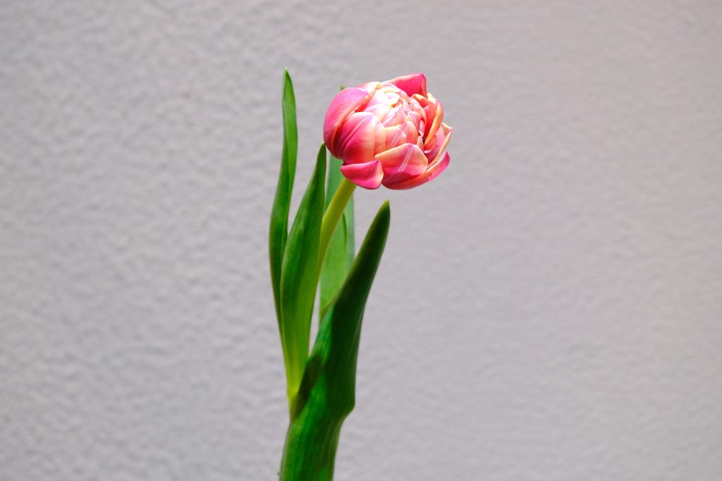 チューリップは気温の変化によって開閉し、切り花でも光の方向に向かって伸びることがあります。そんな、見るたびに変化が感じられるチューリップは、一輪挿しにとてもよく似合う花です。