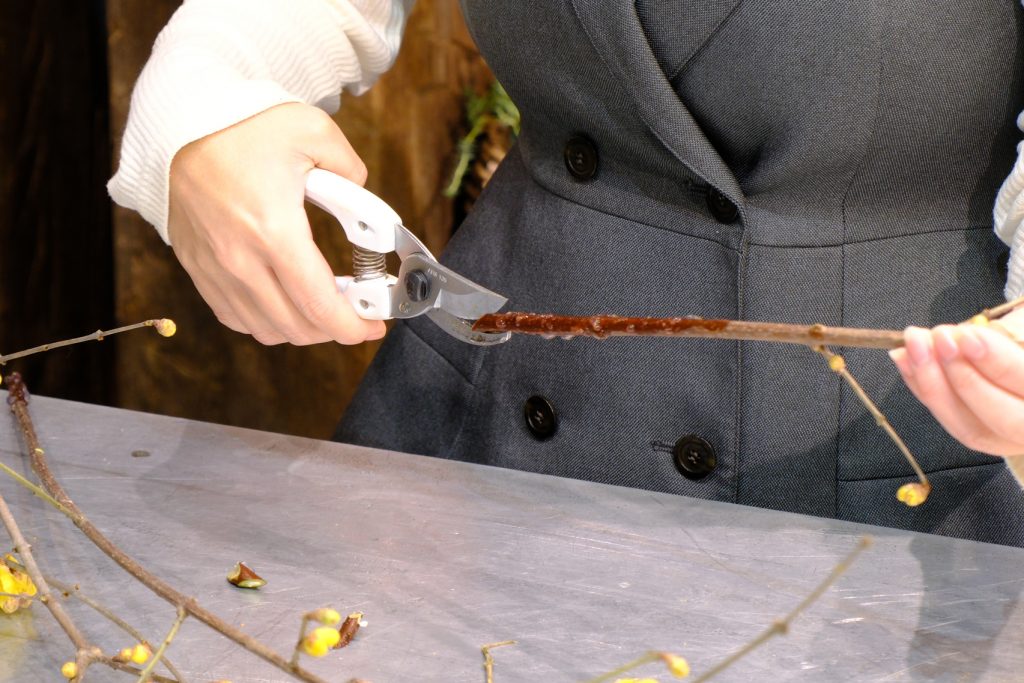 蝋梅は活ける枝に切り込みを入れておくと、水が揚りやすくなります。