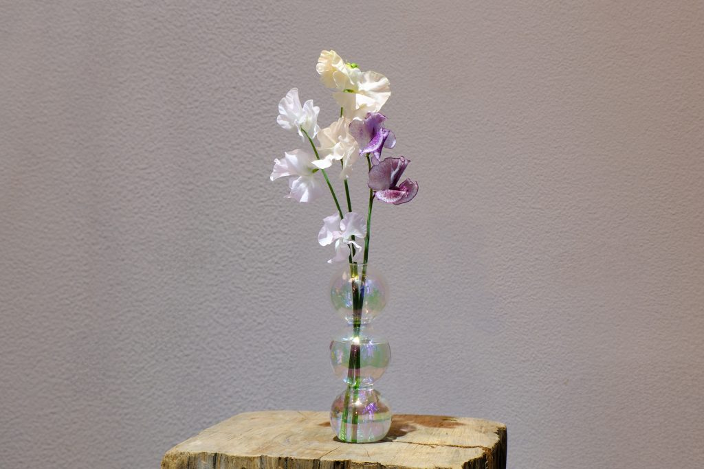 オーロラのようなガラスの風合いがスイートピーの繊細な雰囲気と響き合い、軽やかな春の空気を運んでくれるようです。