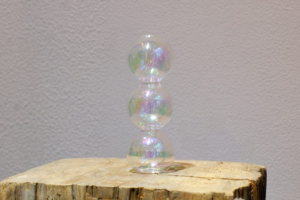 生け替えには、ガラスのボールを積み重ねたデザインの花器を選びました。