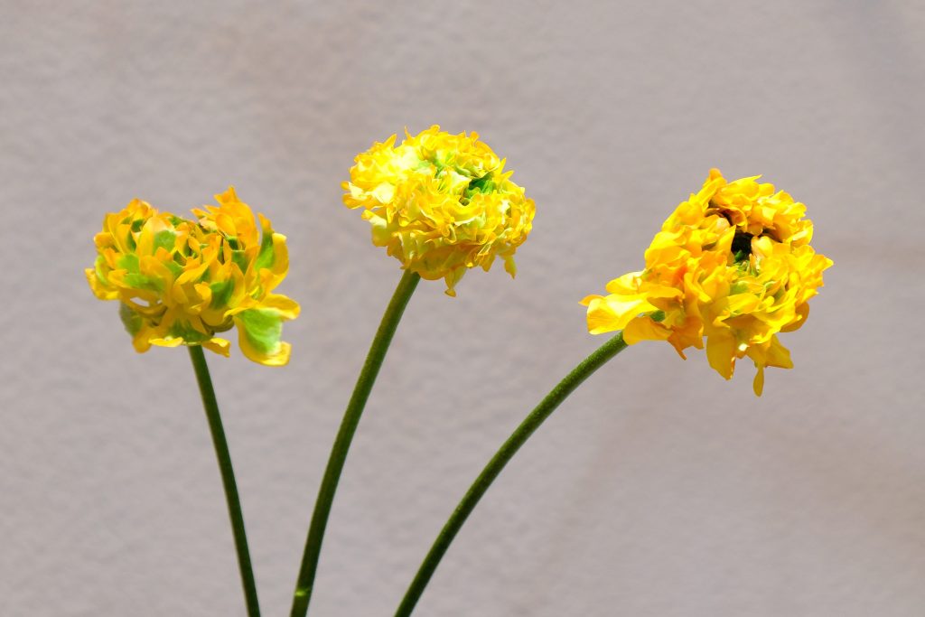 前半でラナンキュラスの全体の姿を楽しんだら、今度は花色に注目した生け方をしてみましょう。