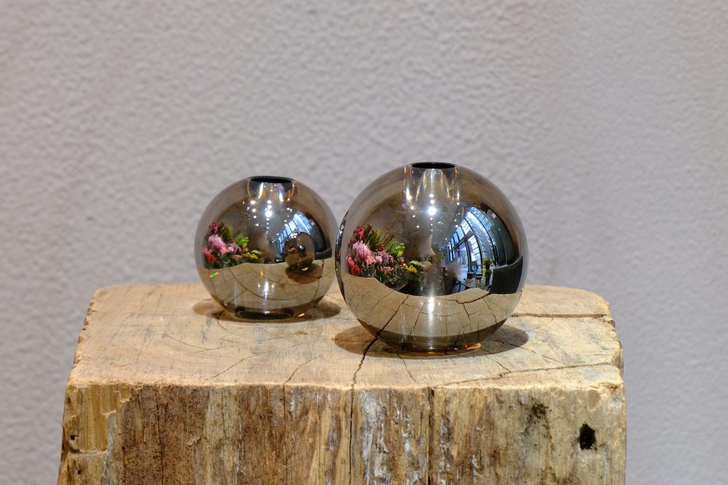 まるで鏡のような、モダンなデザインの一輪挿しを使用しました。