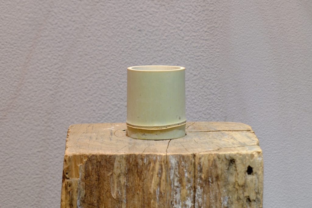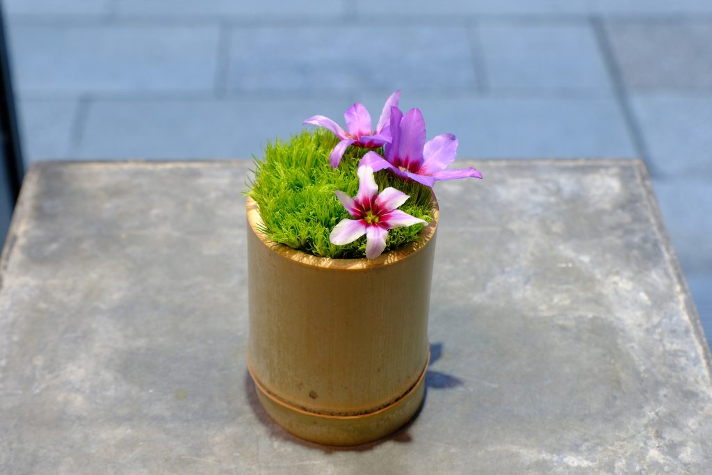 今回は竹筒を花器として使用しました。水漏れすることがありますので、直接水を入れず、水を入れたグラスを置いて使用すると安心です。
