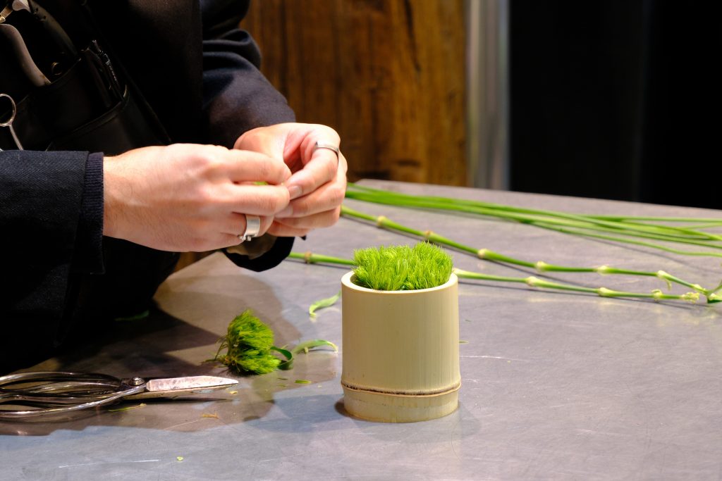 竹筒でなくとも、小ぶりなバスケットなどにも使えるテクニックです。
