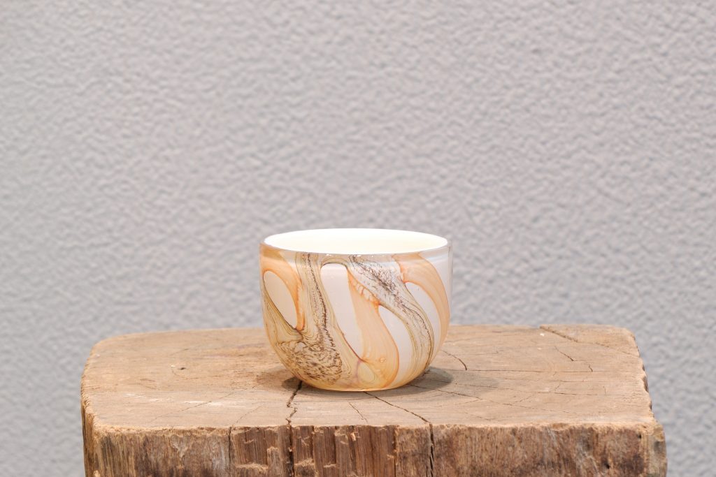 温かみのある花色に合わせて、大理石のような模様入りのガラス花器を選びました。