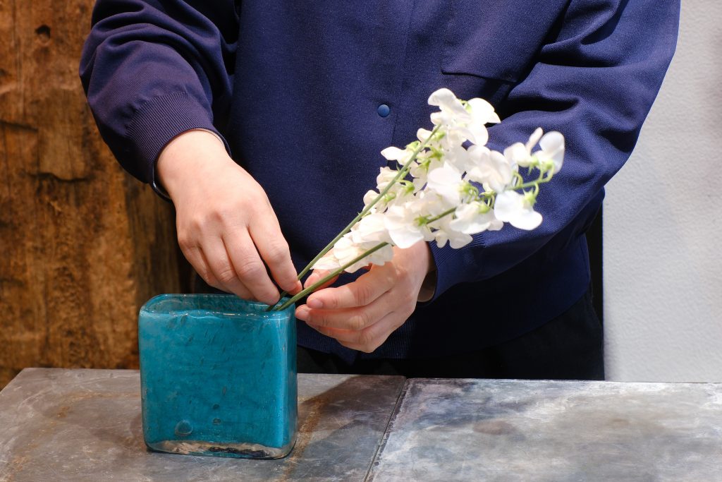 今回は、宿根スイートピーの軽やかさを引き立てつつ、花器のターコイズブルーと色をつなぐ存在として、ユカリブルーを選びました。