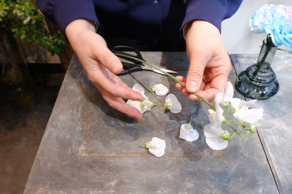 ・スイートピーのように縦に花を付ける花材は、下の花から終わっていくため、傷んだ花は取り除いてから生けます。